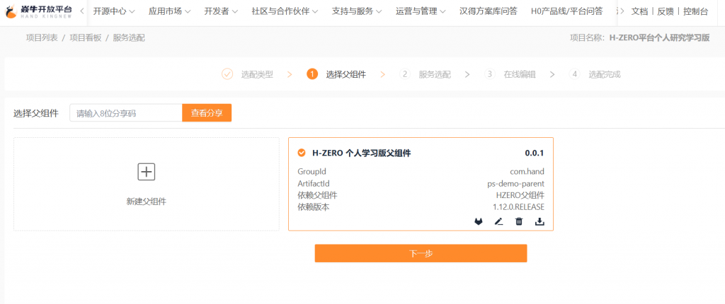 进入之后,要选择一个父组件,原来没有父组件,就新建了一个父组件:H-ZERO个人学习版父组件,然后进入下一步:
