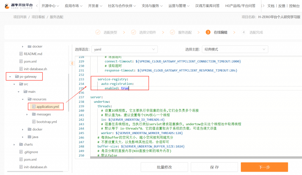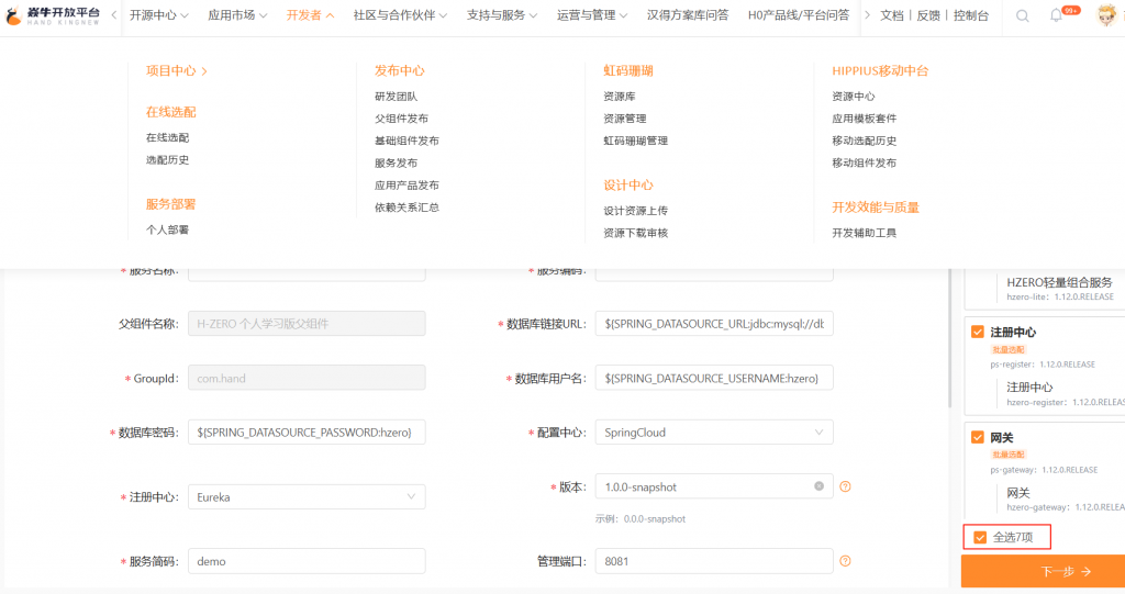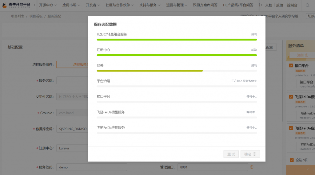 我们这里选HZERO轻量服务组合、网关、注册中心、平台治理、接口平台、飞搭模型服务、飞搭配应用服务 七个;