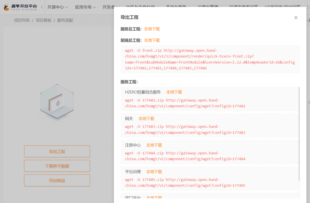 确认批量修改,回到上个界面,这里服务名称和服务编码不用输入,在右边 打勾”全选7项“,进入”下一步“ 即可生成工程和种子数据;