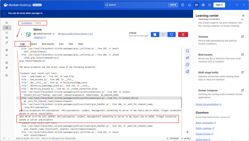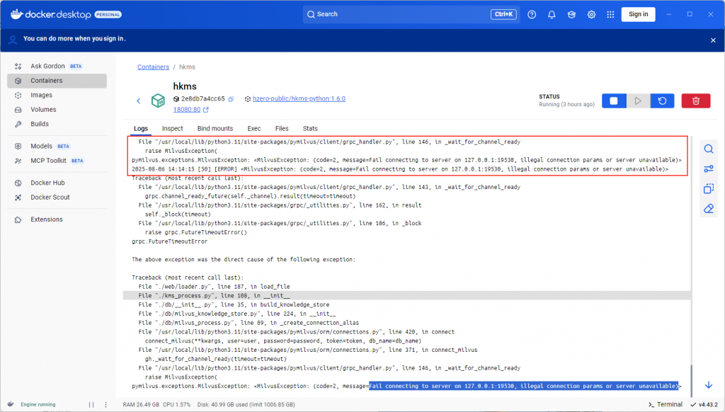 7、文档向量化时发生错误,链接不到milvus服务器,milvus服务意外关闭