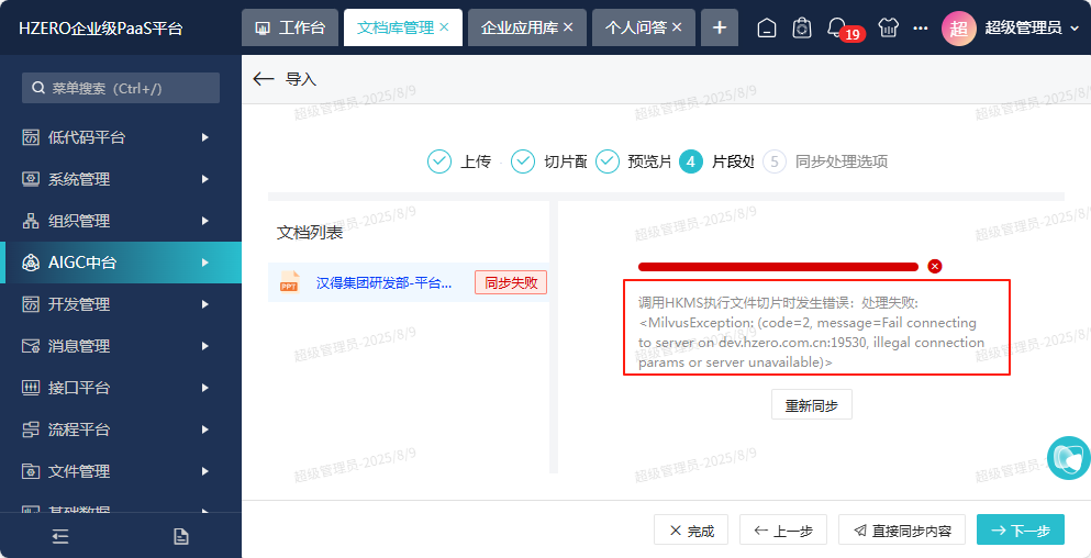 失败原因:调用HKMS执行文件切片时发生错误:处理失败:haip.error.hkms.milvus_error – Collection field dim is 1536, but entities field dim is 2048