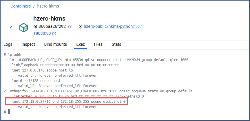 从日志看,hzero-aip-app链接HKMS时,链接被拒绝了。那我们先测试这两个容器之间的连通性: