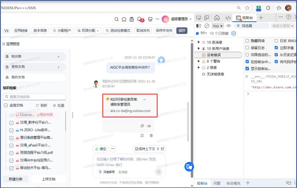 问题五、知识问答涉及的跨域访问问题,HKMS服务访问问题和大模型APIkey问题。