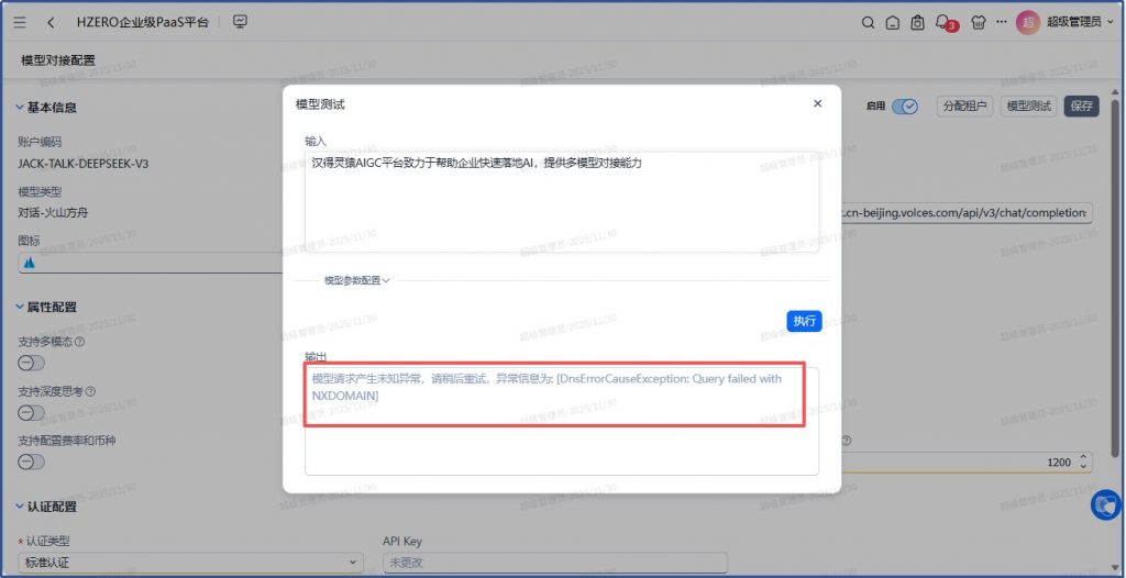 在模型账号对接的测试的地方也是遇到同样的问题了:出现了DNS 错误。