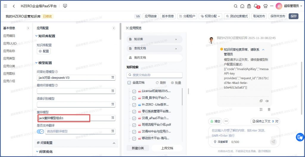 知识问答,报了另外一个错误,说是API KEY 错误,大概是重排模型的APIkey 还没填进去