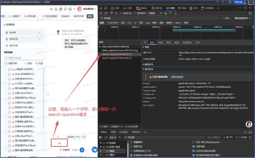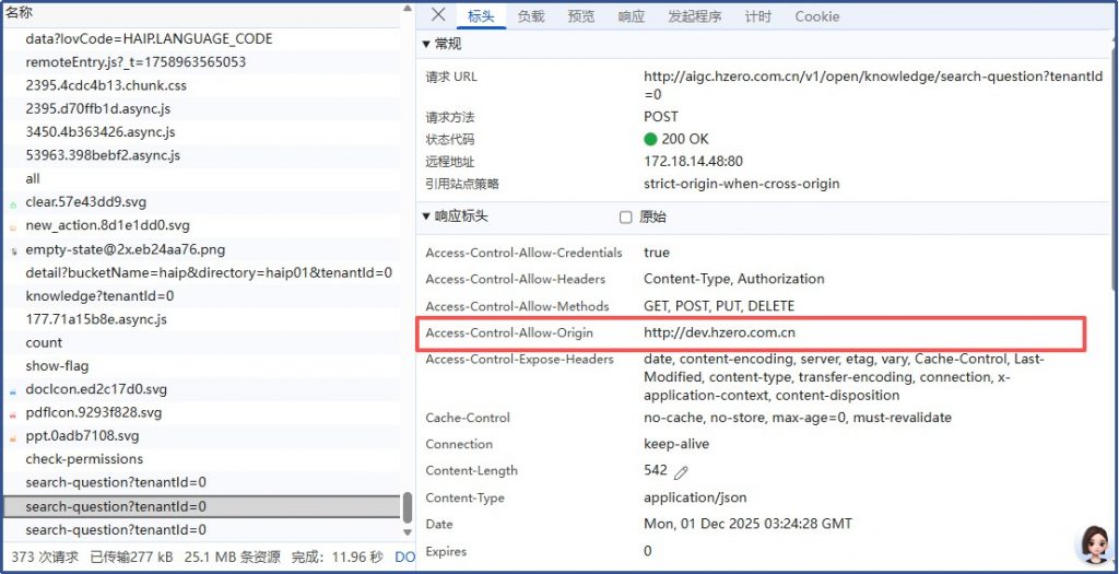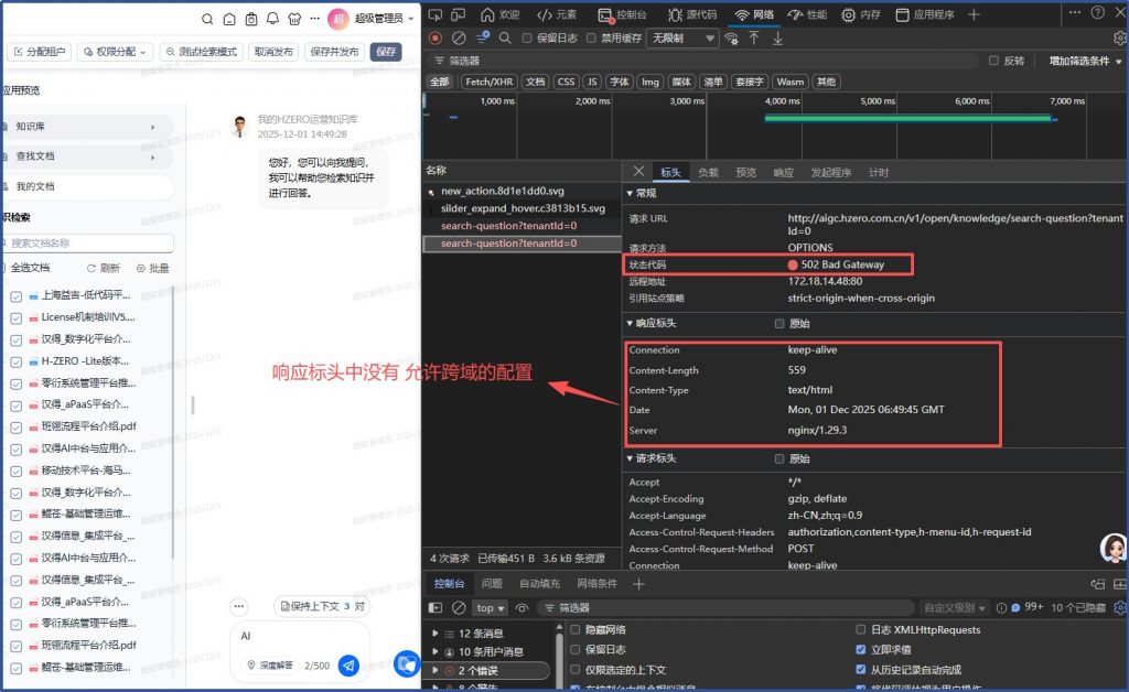 不过有个问题始终存在,那就是每次容器服务全部重启之后再去测试《我的HZERO运营知识库》知识库问答的时候,当我们开始输入问题的时候,系统就会去找相似问题提供选择,这时就会调用aigc.hzero.com.cn 网关中的API了,这个时候涉及跨域,因为我们的原始域是dev.hzero.com.cn , 浏览器发送请求给aigc.hzero.com.cn的时候会告诉服务端这是跨域,等服务端返回消息,要看返回消息中是否包含 响应头(服务器配置):Access-Control-Allow-Origin,并且Access-Control-Allow-Origin 明确是包含了发送的原始域,或者*(所有域);如果返回的消息中没包含,那么浏览器就拒绝把响应消息返回给浏览器前端用户,直接阻塞掉了。