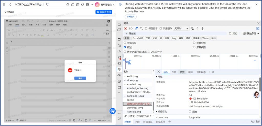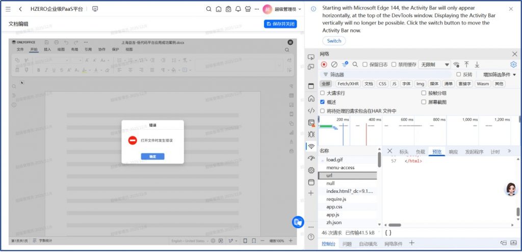 这个错误应该是onlyoffice报的错,在hzero-file服务日志和onlyoffice的容器日志中都没有错误信息。