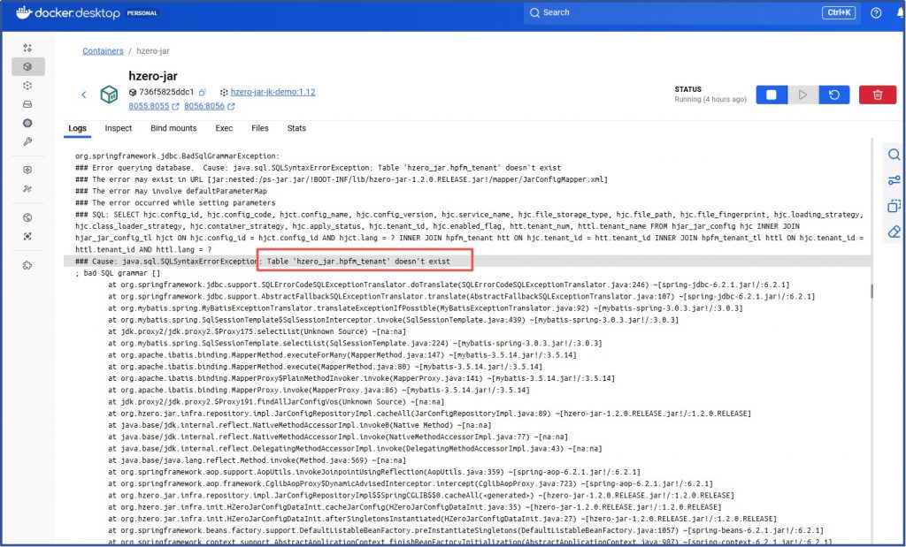 org.springfranework.jdbc.BadSqlGrannarException:# Error querying database. Cause: java.sql.SoLSyntaxErrorException: Table ‘hzero jar-hpfn tenant’ doesn’t exist# The error nay exist in URL [jar:nested:/ps-jar-jar/!B00T-INF/lib/hzero-jar-1.2.0.RELEASE. jar!/napper/JarConfigMapper .xnL]