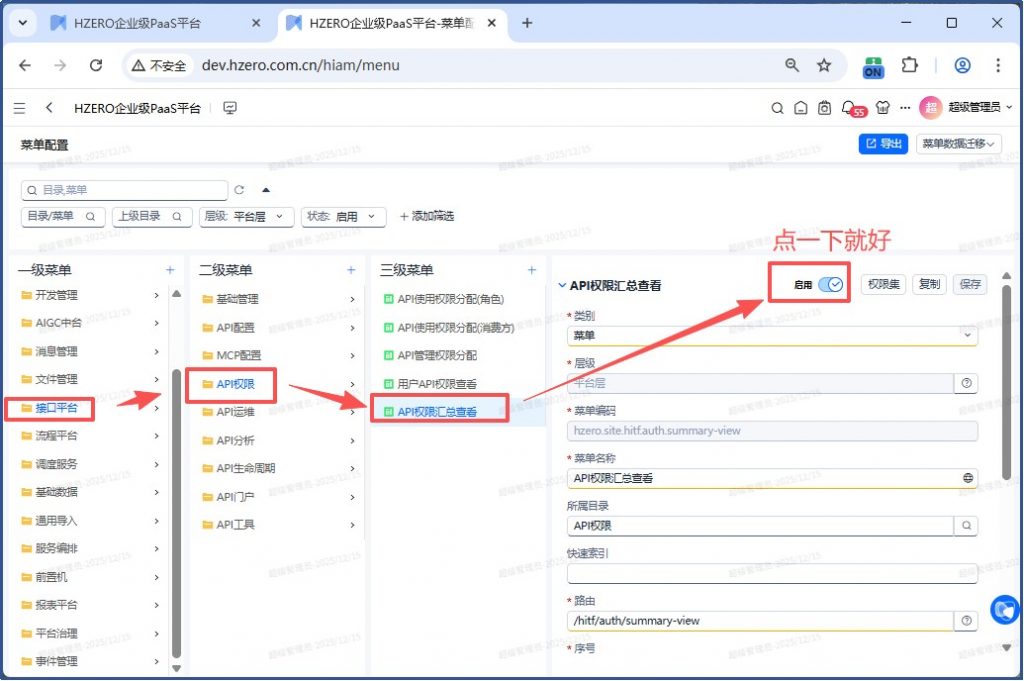 路径:平台菜单/接口平台/API权限/API权限汇总查看