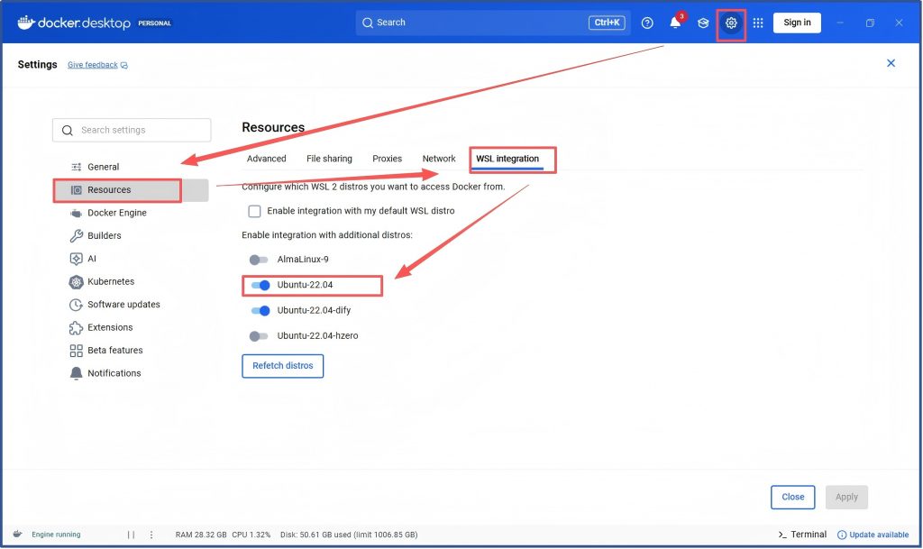 1.2 如果你是在windows上使用WSL, 那么直接安装Docker Desktop(包含Docker引擎和Docker compose, 且为可视化管理),然后再做WSL跟Docker Desktop的集成即可(在Docker Desktop的右上角的Setting齿轮/Resoures/WSL intergration 处把要集成的WSL开关设置为开 )