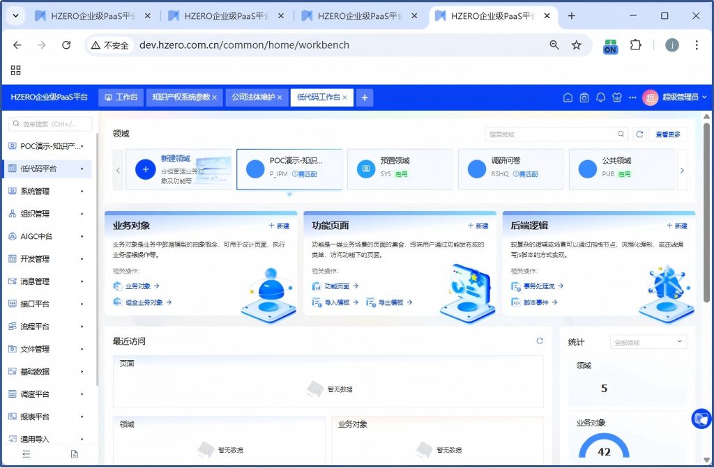 选择低代码POC演示租户 ,进入系统后点右上角的“前往控制台”,然后点左上角菜单,选择菜单”POC演示-知识产权管理” ,可以看到一个低代码搭建的关于知识产权管理的应用.