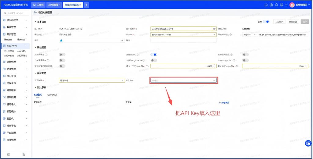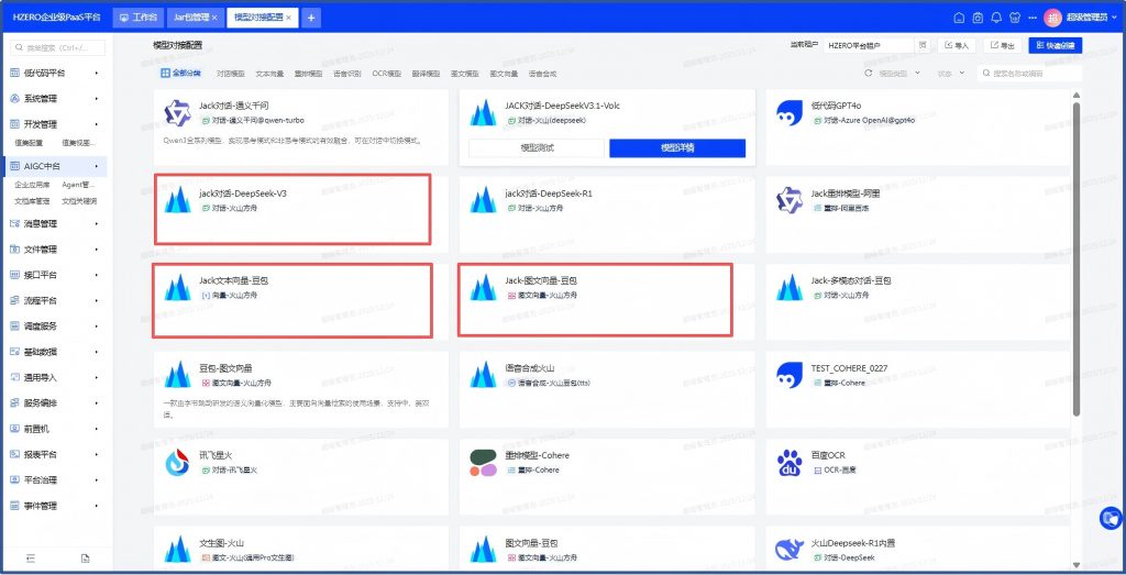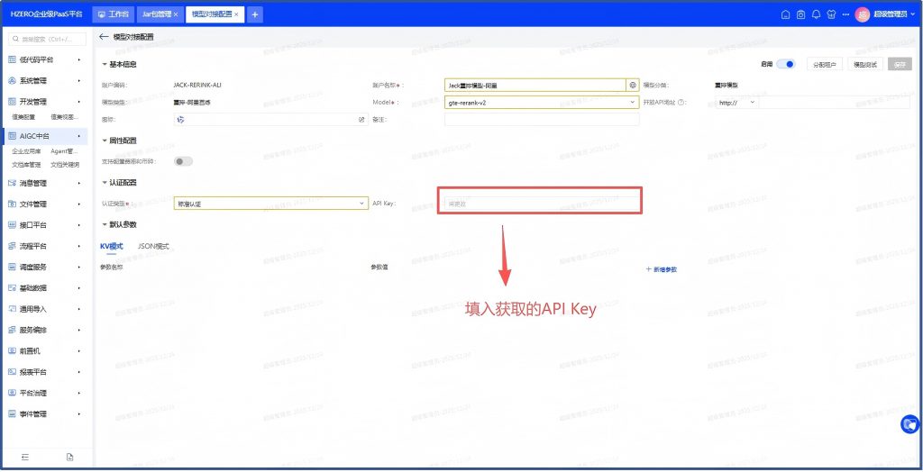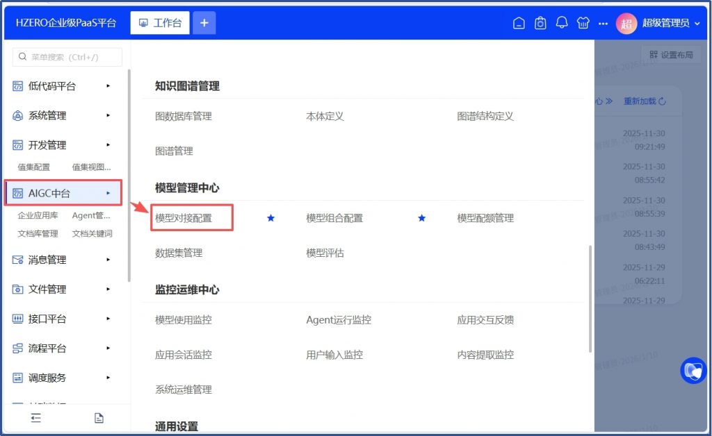 切换租户,选择HZERO 平台租户 ,进入系统后点右上角的“前往控制台”,然后点左上角菜单,进入AIGC中台/模型管理中心/模型对接配置