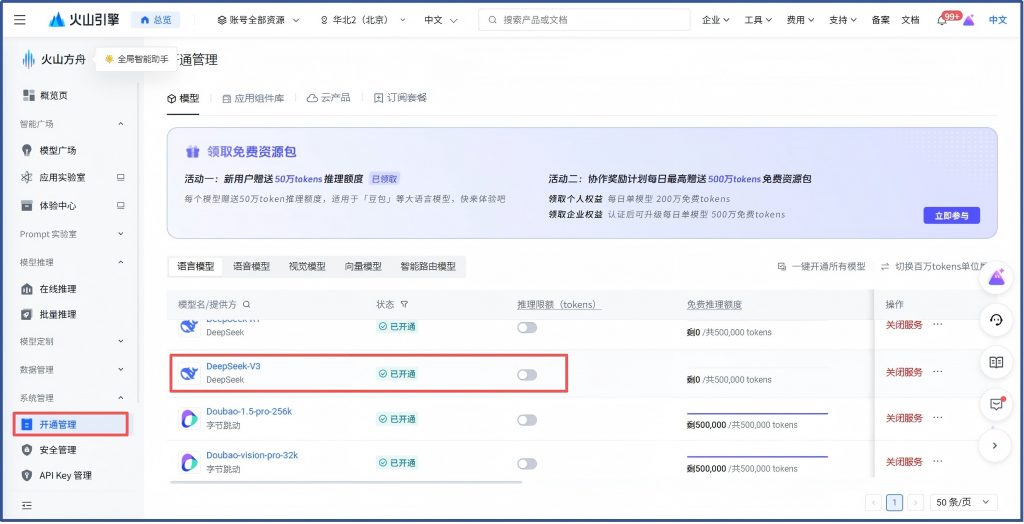 2.1.1 你需要预先在火山引擎注册账号 https://www.volcengine.com/, 然后从主页 /大模型/豆包大模型1.8进入,然后选择左边的“开通管理”菜单,找到DeepSeek-V3,Doubao-embedding-large,Doubao-embedding-vision 这三个模型,点操作“开通服务”