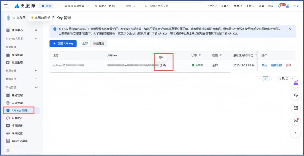 2.1.2 在火山引擎/火山方舟 左边菜单 API key管理 处,复制API-KEY