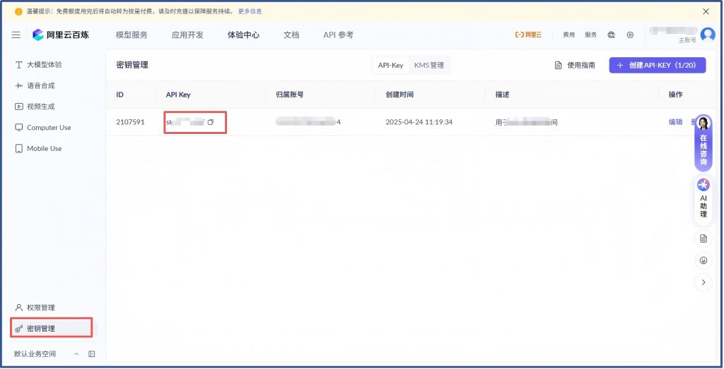 2.2.1 你需要预先在阿里云注册账号 ,然后在主页/大模型/免费体验 进入阿里云百炼平台,然后点左下角的密钥管理可获取API Key