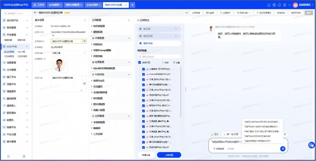 选择HZERO 平台租户 ,进入系统后点左上角菜单,进入AIGC中台/应用中心/企业应用库, 点击进入“我的HZERO运营知识库”, 可以咨询Hzero平台相关问题,比如 :你可以问:“飞搭会用到AI平台功能吗?”