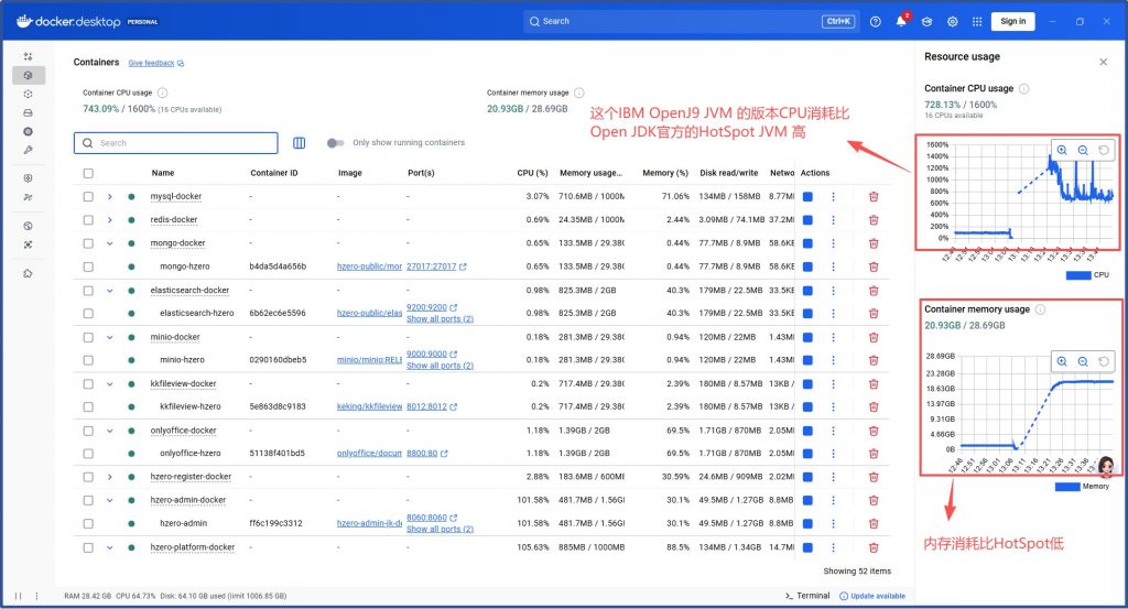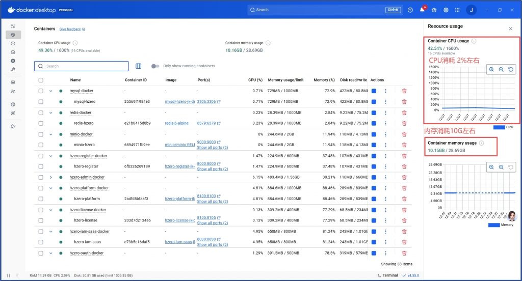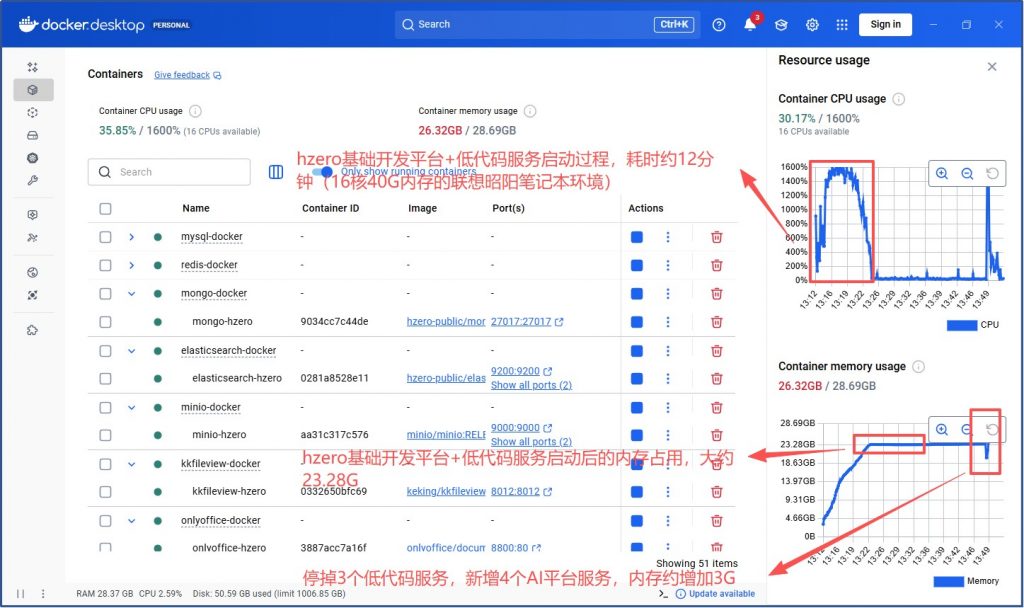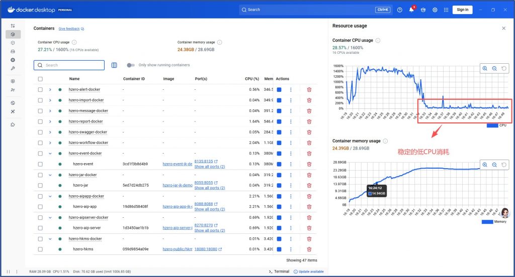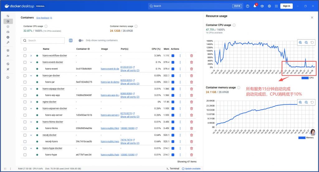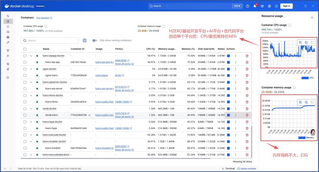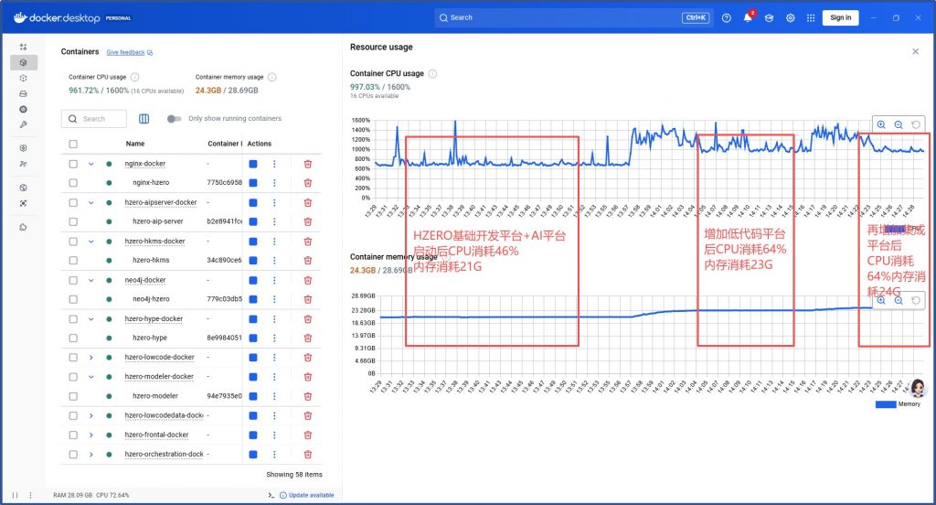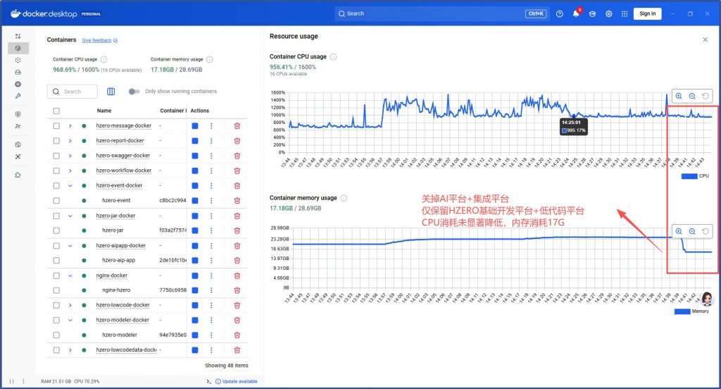 关掉AI平台+集成平台仅保留HZERO基础开发平台+低代码平台CPU消耗未显著降低,内存消耗17G: