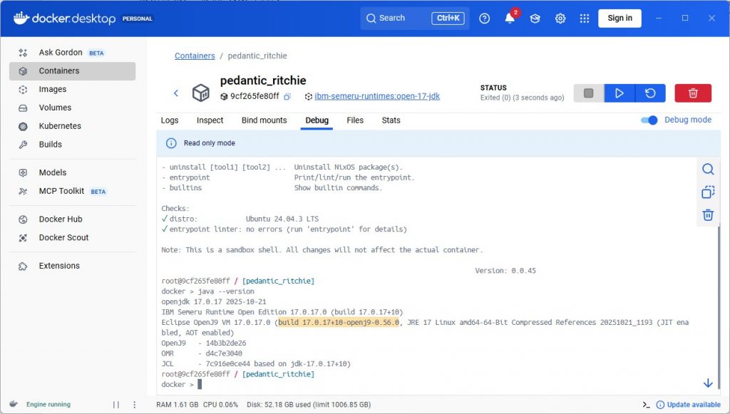 看这个镜像的具体信息:是openJDK 17.0.17 + OpenJ9-0.56的: