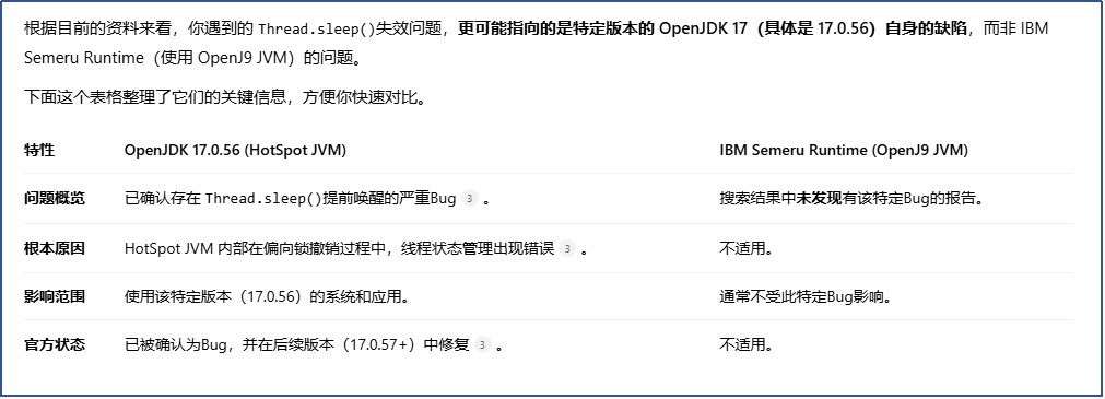 OpenJ9 是IBM对JVM的一个实现,之前同事说0.56他测试下来有问题,sleep失效,导致涉及schedule的cpu全炸了。经询问元宝,说是open JDK 17.0.56这个版本的问题,并非IBM OpenJ9 0.56这个JVM的问题。 跟openJ9 JVM没有关系,这个bug是open JDK 17.0.56引入的,并在open JDK 17.0.57中被修复,只要避开open JDK 17.0.56就行。