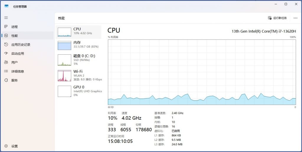 启动完成后,CPU消耗维持在10%左右:
